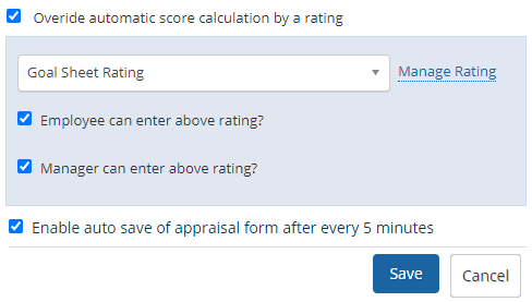 - Select Enable auto save of appraisal form after every 5 minutes checkbox to auto save the contents of the form frequently.