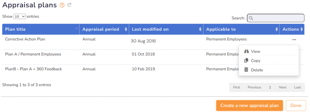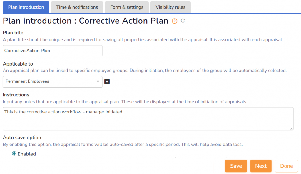 ● Click on the View icon corresponding to the appraisal plan that you want to configure for its time and appraisal notifications. A new page appears where you can configure settings in the Plan introduction, Time & notifications, Forms & settings, and Visibility rules tabs.