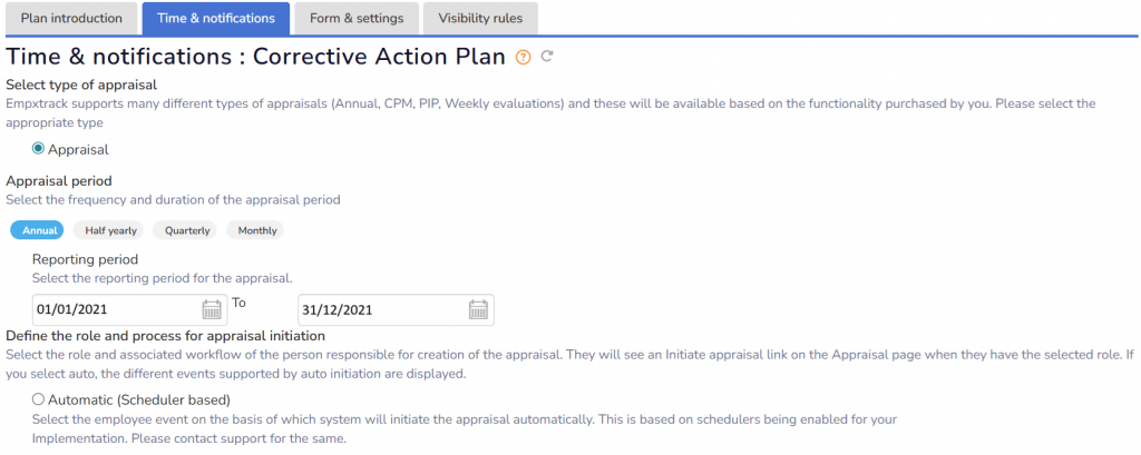 Setup appraisal timelines and notifications for a performance appraisal plan. Configure settings related to the time frame of the appraisal plan. This includes the type of appraisal (Annual, Half-yearly, Quarterly or Monthly), the appraisal period for which the appraisal is carried out. Set automated reminders to initiate the appraisal two-three days before the date of the appraisal.