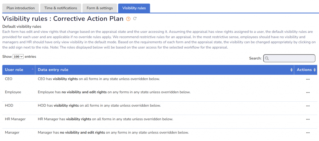 ● Click on the Visibility Rules tab. The page displays the default visibility rules set for all the forms for all the stakeholders of the selected workflow for the appraisal plan. By default, no user has visibility rights on any appraisal form.
