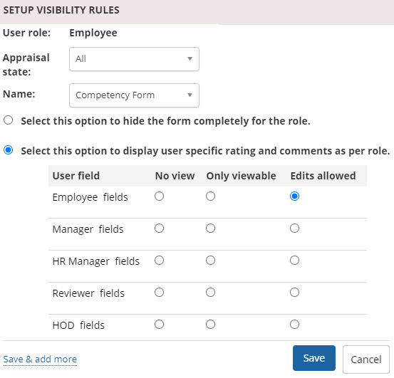 b. Choose Select this option to display user specific rating and comments as per role option to allow employees to view their own ratings and comments on the competency form.