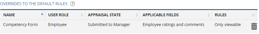 Once the default rules are configured, create override rules so that each state of the workflow can be handled separately for each user. For example, you cannot allow edits to employees on appraisal forms once the form is submitted to their managers.