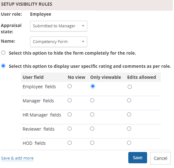 You can now override the full view and edit rights for the employee role on the forms where it is not required.Setup Visibility Rules