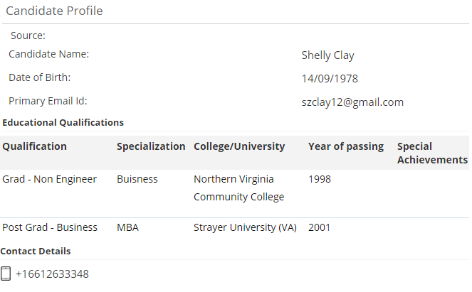 - Click on Candidate name to view their profile. The experience details of the candidate appears in a new window as shown in Figure 3. Click Close to leave the page.