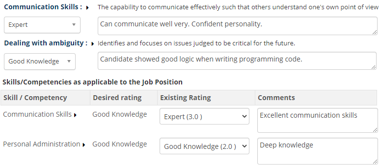 - Provide feedback in the Skills/ Competencies as applicable to the Job Position section. For each skill and competency, specify the rating from the Existing rating dropdown and mention your Comments.